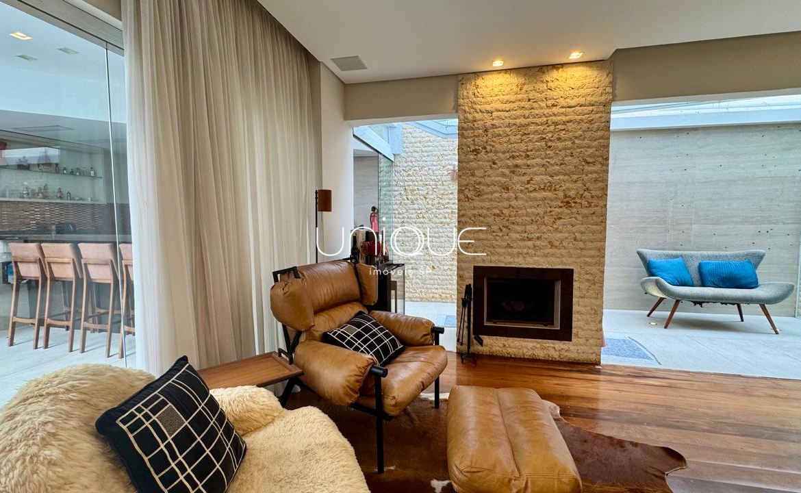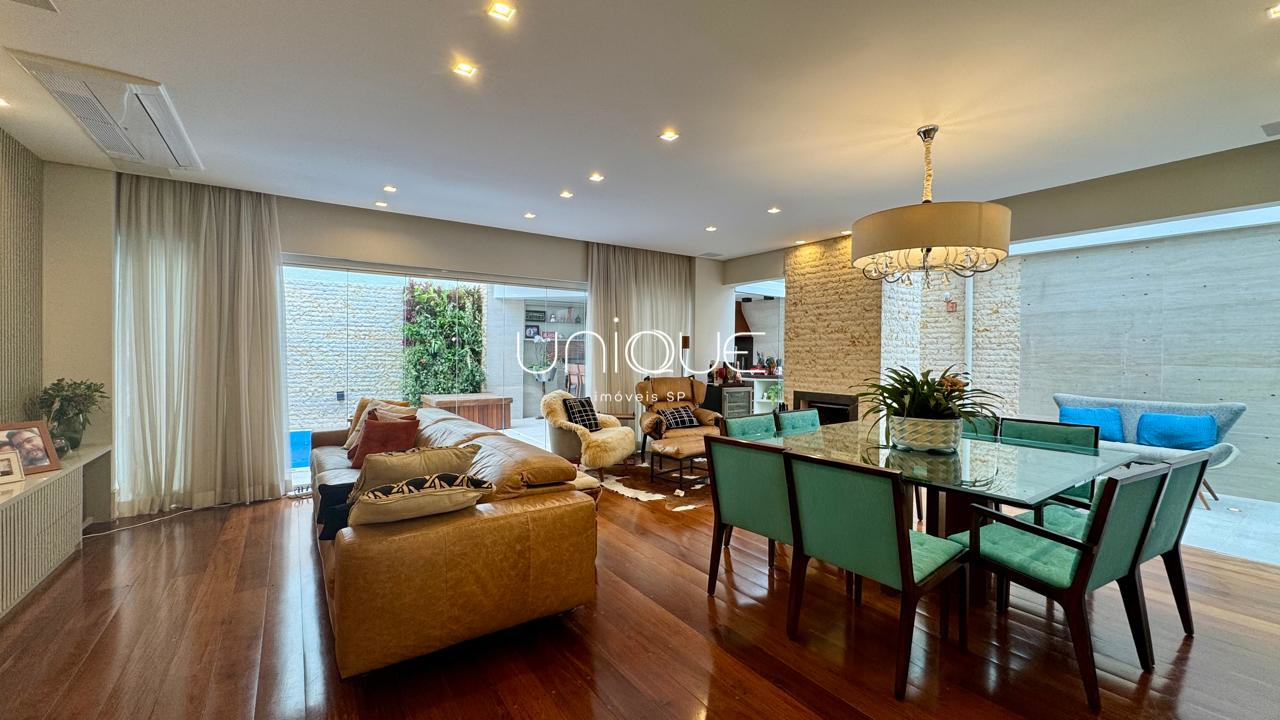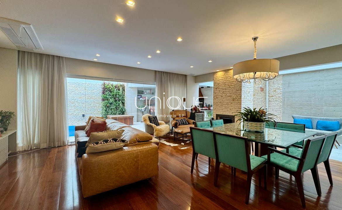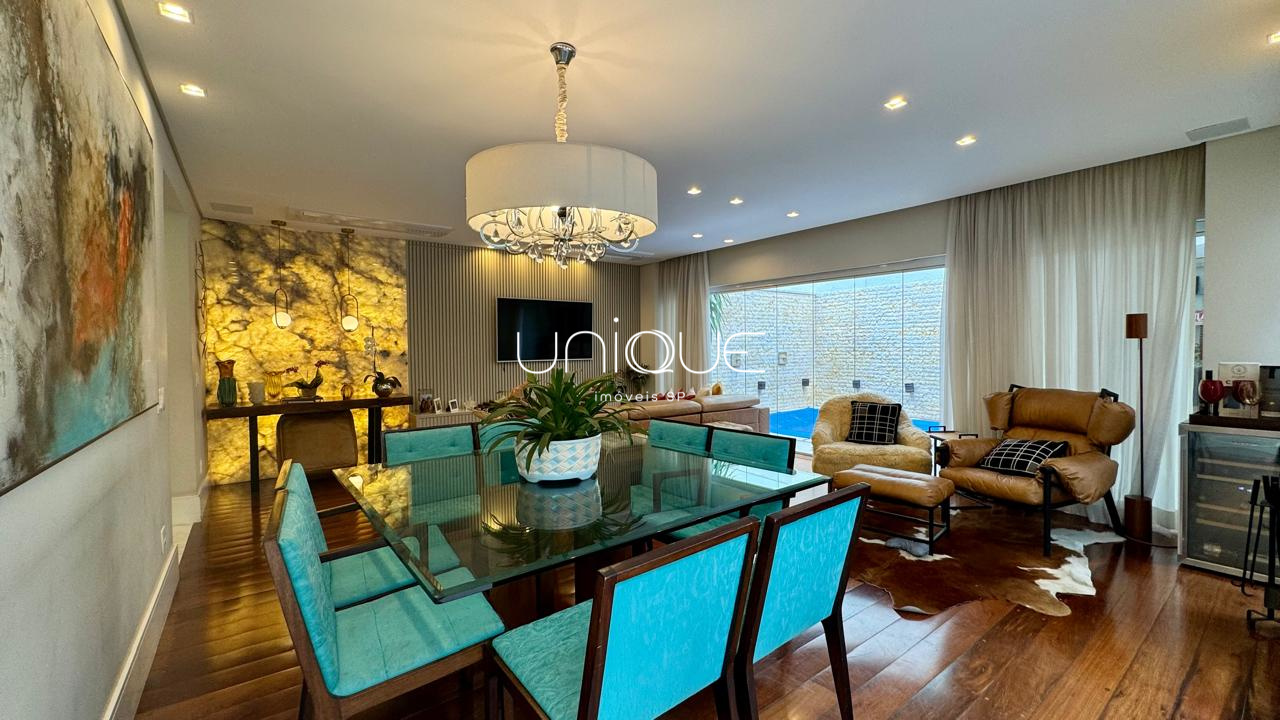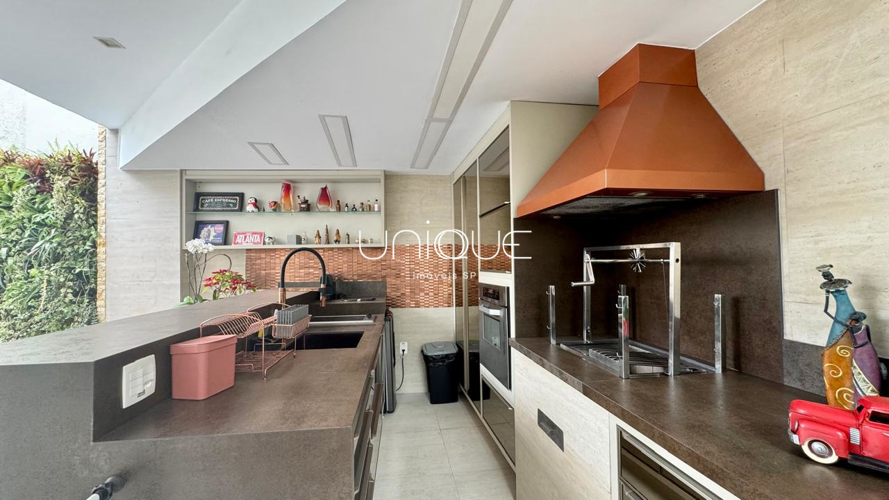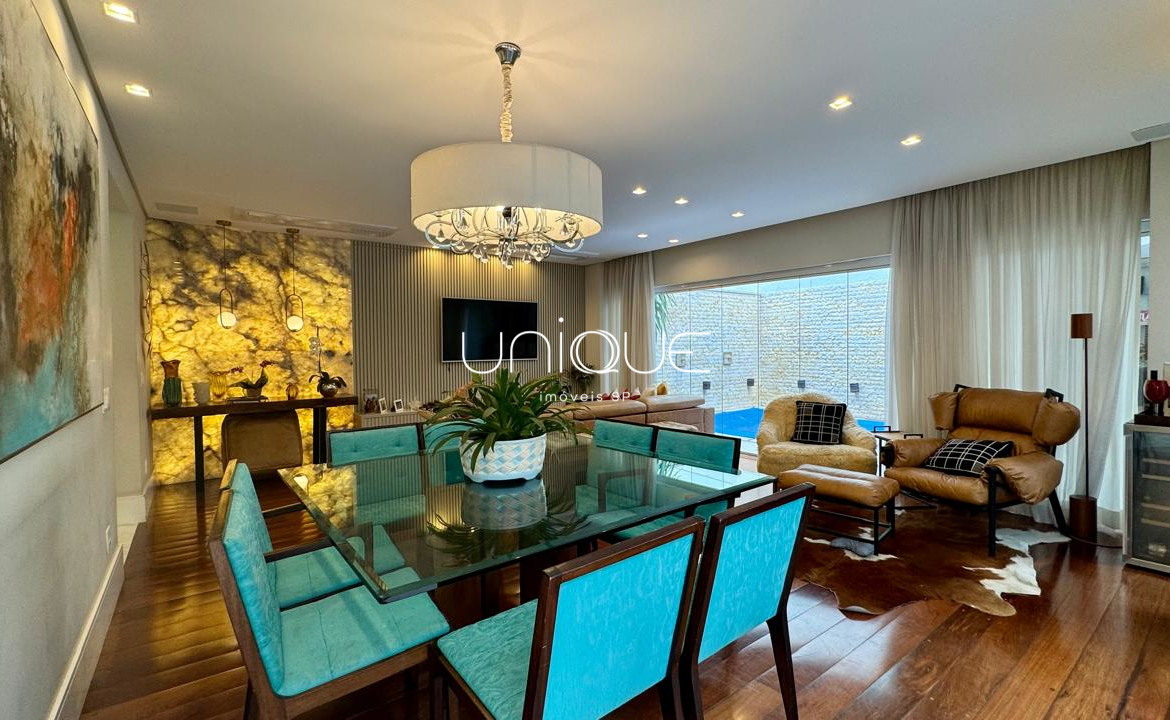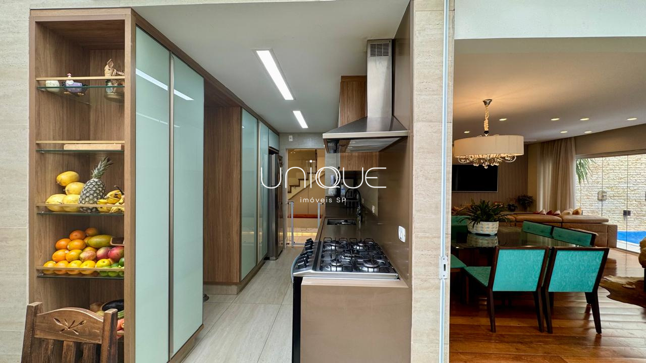 No piso térreo, você encontra uma ampla sala de estar e jantar, climatizada com ar-condicionado e equipada com lareira, perfeita para receber com elegância. Nos fundos, um espaço gourmet com piscina e churrasqueira convida a momentos memoráveis com família e amigos. A cozinha é totalmente equipada e integrada à área de serviço, que inclui dependência completa com quarto e banheiro para funcionários.